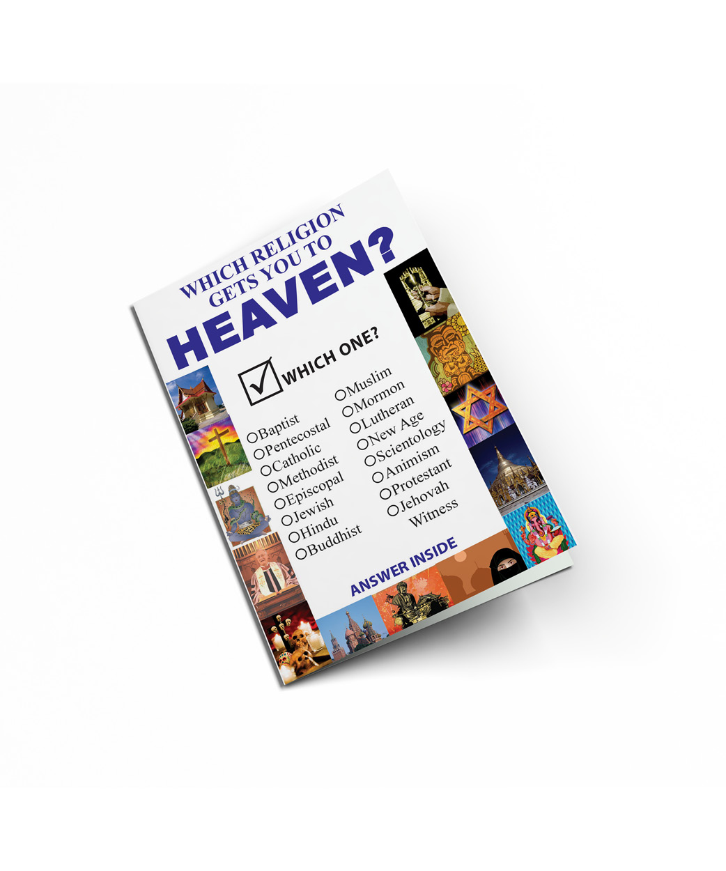 This attention-grabbing gospel tract gives people the opportunity to take a quiz which asks them which religion they think will gain them entrance into Heaven. Inside, the tract reveals that the question is not, “Which religion”, but rather, “Have you placed your trust in Jesus Christ?”